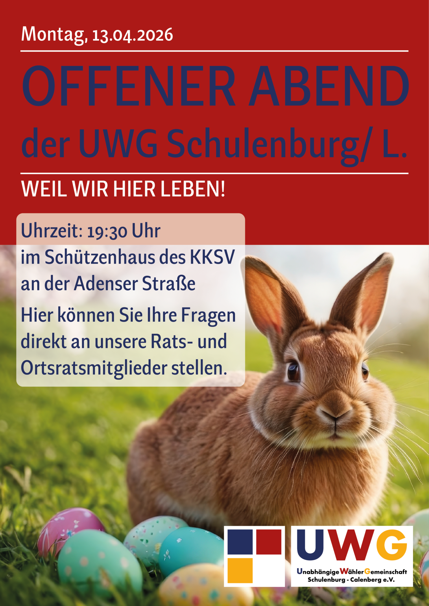 Um Schulenburg auch weiterhin zukunftsfest aufzustellen und die Attraktivität des Ortes zu erhalten, sind mir und der UWG Ihre Anregungen besonders wichtig. Wir sehen uns als Vertreter Ihrer Interessen und laden Sie deshalb herzlich ein, sich aktiv an den Prozessen in unserem Ort zu beteiligen.